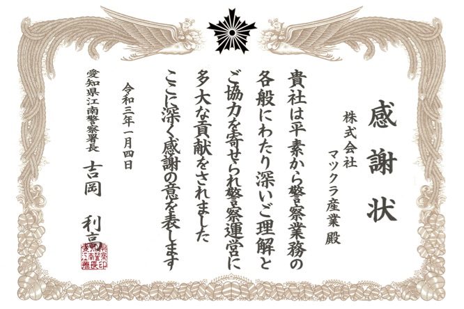 この度弊社では愛知県警と共同開発における貢献が認められ、2020年に続き2度目の感謝状を頂きました。